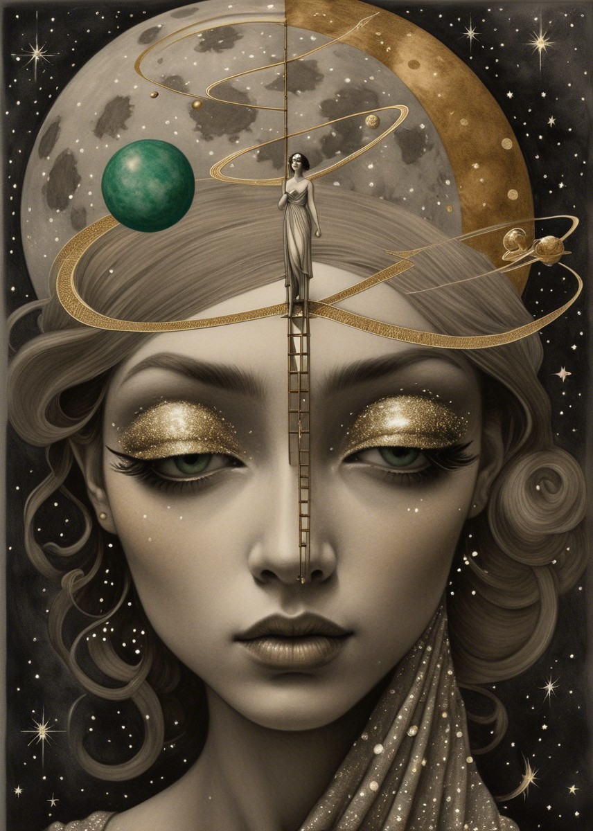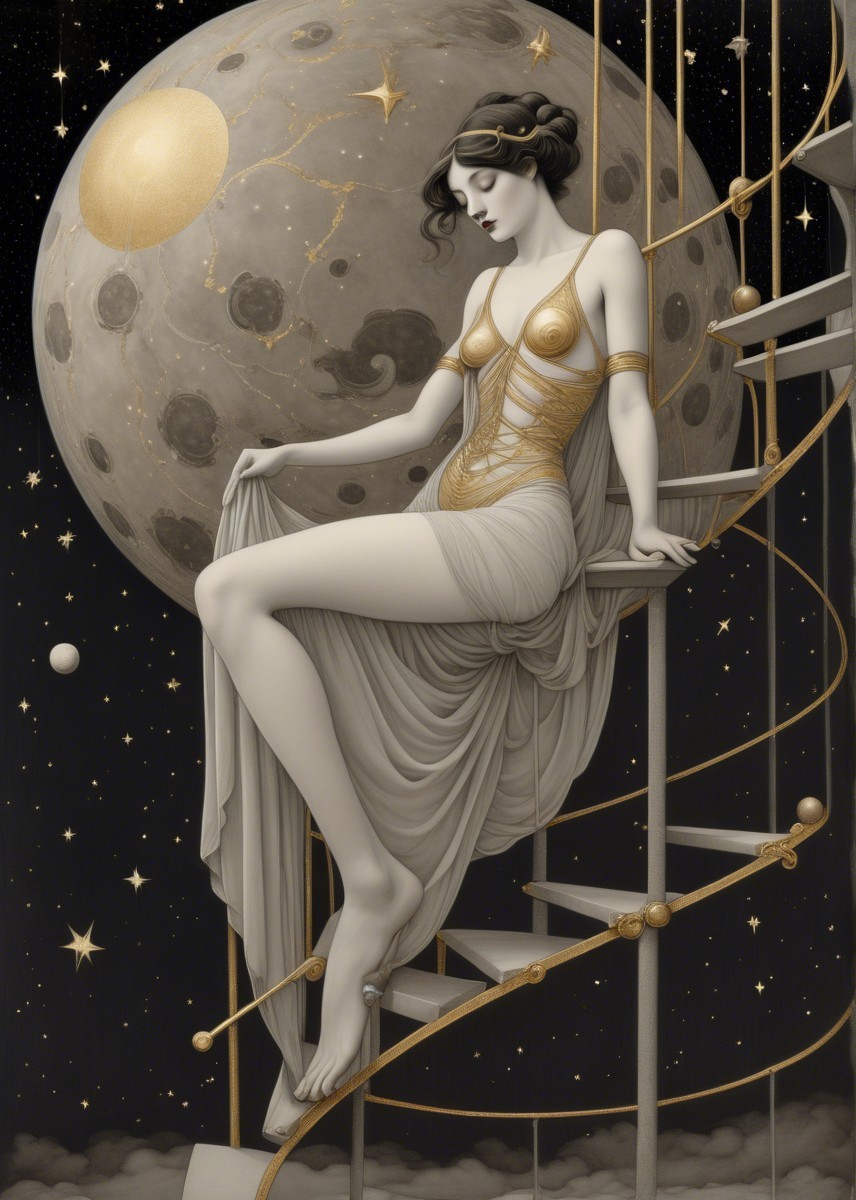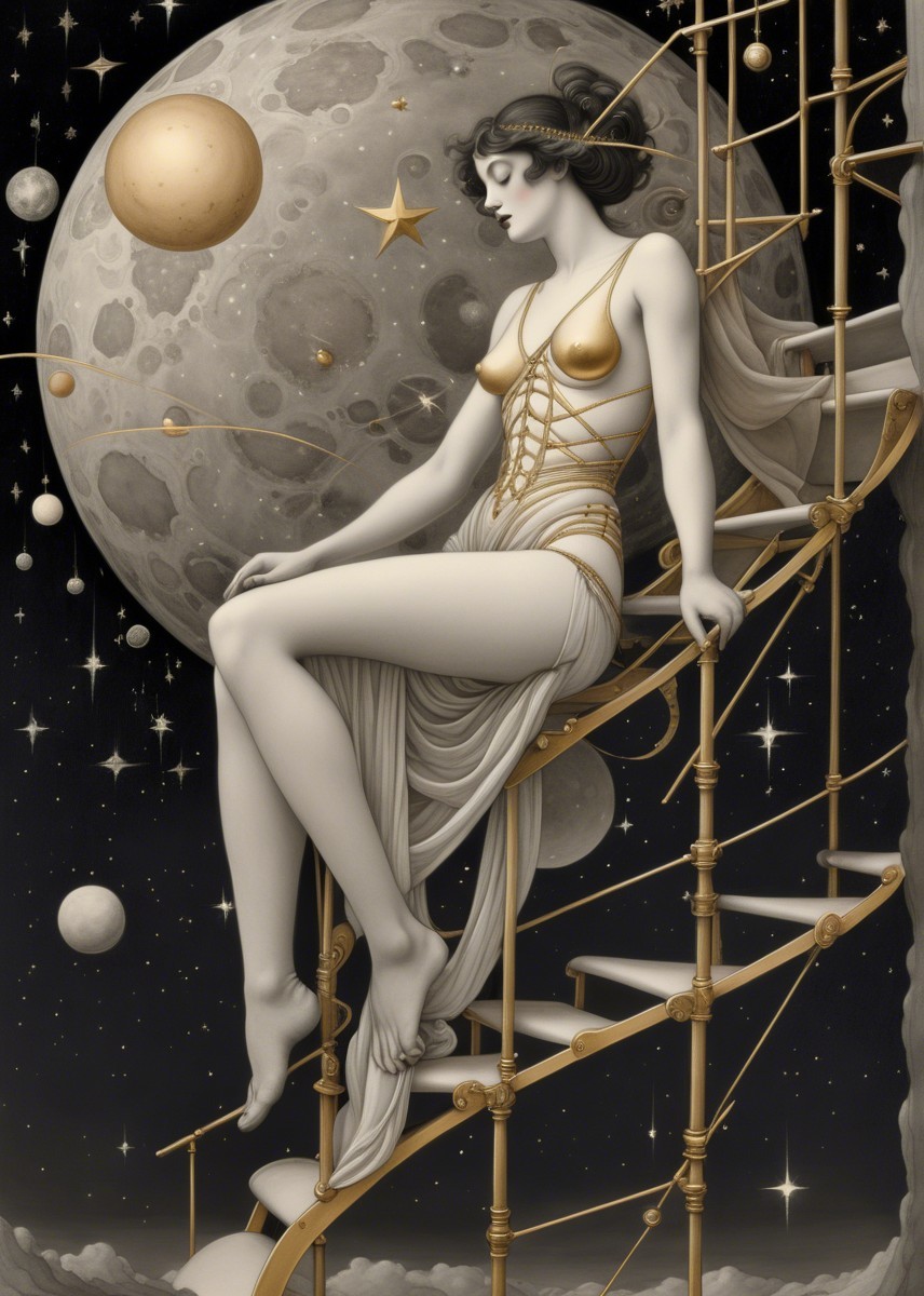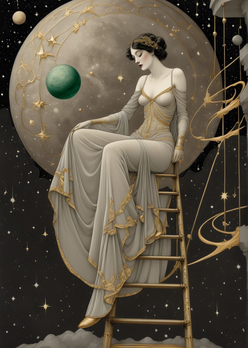An art nouveau-inspired illustration of a woman in gold attire sitting on a ladder against a moon and starry backdrop.