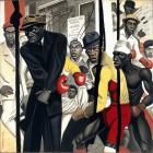 A dynamic group of eight men in 1980s streetwear pose confidently. They showcase diverse expressions and styles, with one holding a basketball, exuding camaraderie and urban culture.