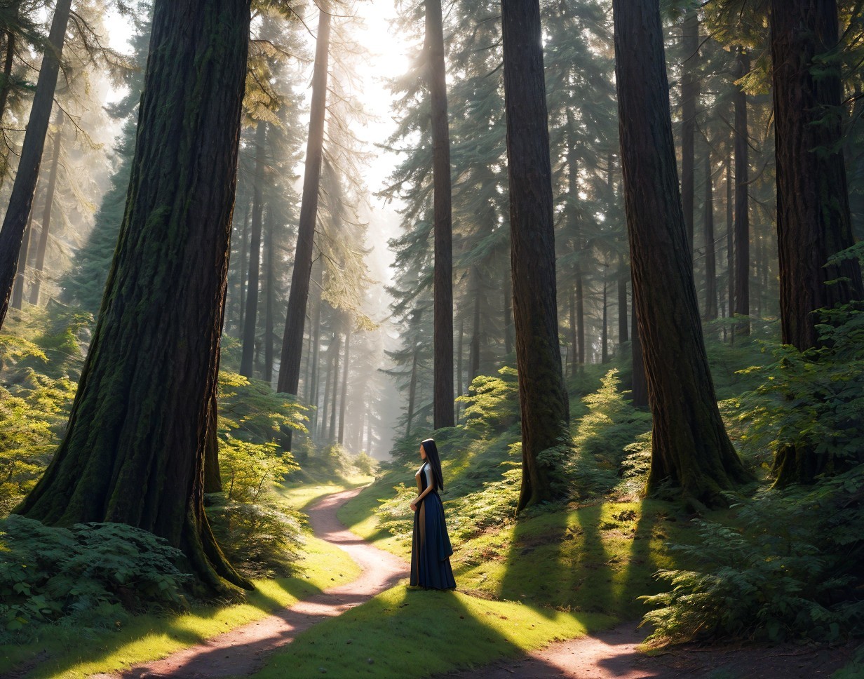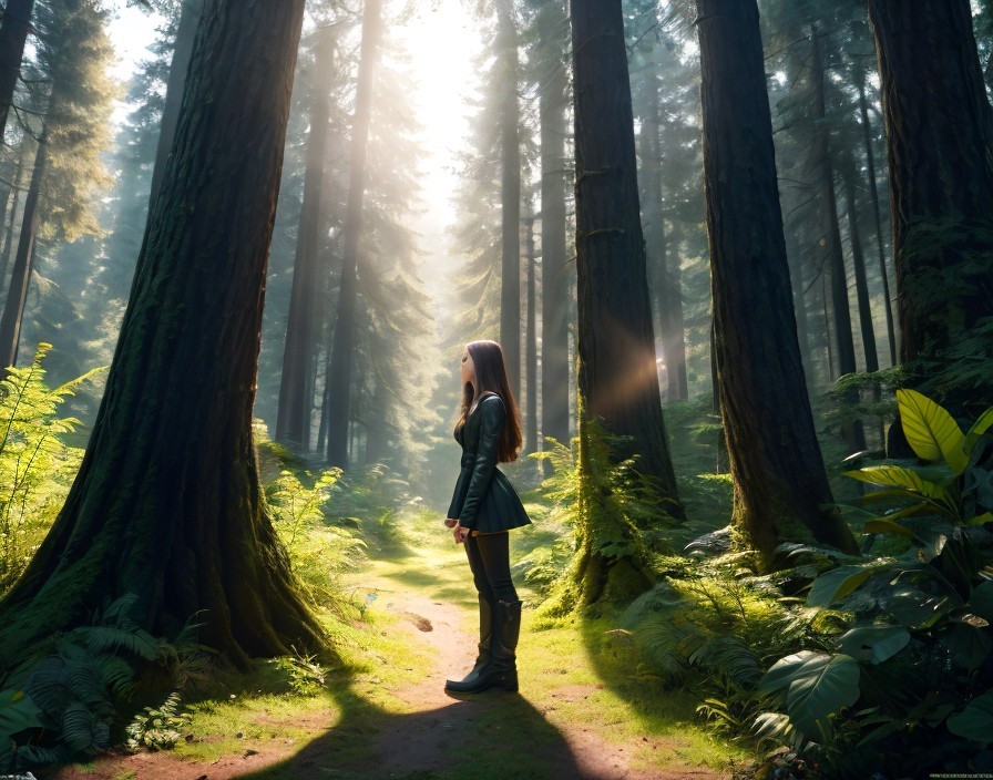 Humanoid android discovering for the first time the beauty of the forest bathed in midday sunlight
