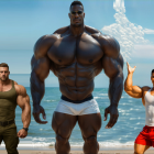 Three muscular men stand on a beach, showcasing impressive physiques. The tallest, in swim trunks and sunglasses, has an exaggerated muscular build, while the others display strong, defined frames.