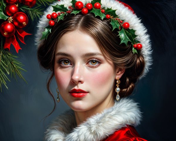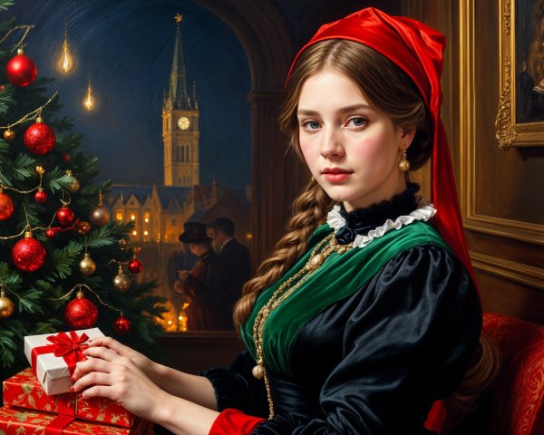 A young woman with elegant features gazes thoughtfully from a window. Dressed in a richly adorned gown and a golden tiara, she is framed by a picturesque cityscape in the background.