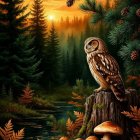 An owl perches on a tree stump surrounded by vibrant mushrooms and colorful foliage, with a serene lake reflecting the warm hues of a sunset and tall pine trees in the background.