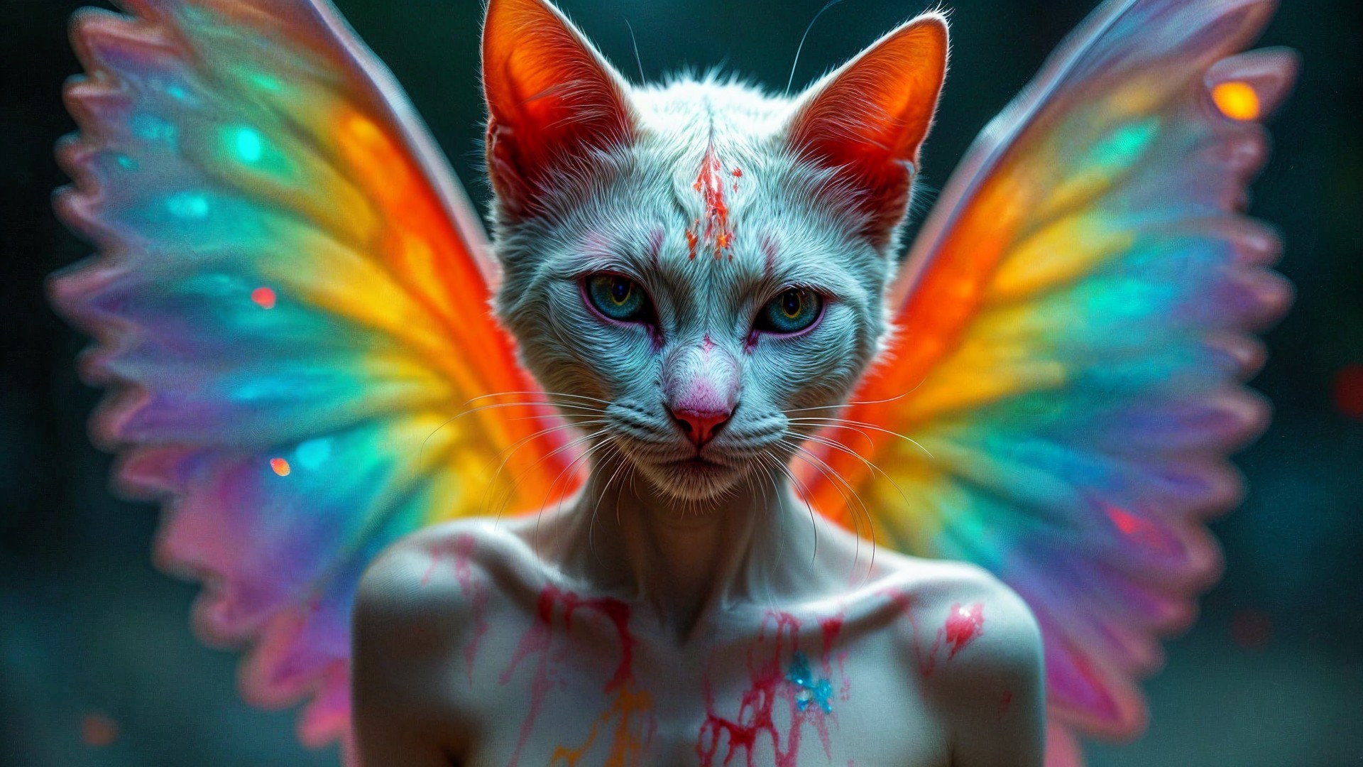 A mystical cat with vibrant, colorful wings sits gracefully, exuding a magical aura. Its striking eyes and splashes of paint on its fur enhance its enchanting appearance.