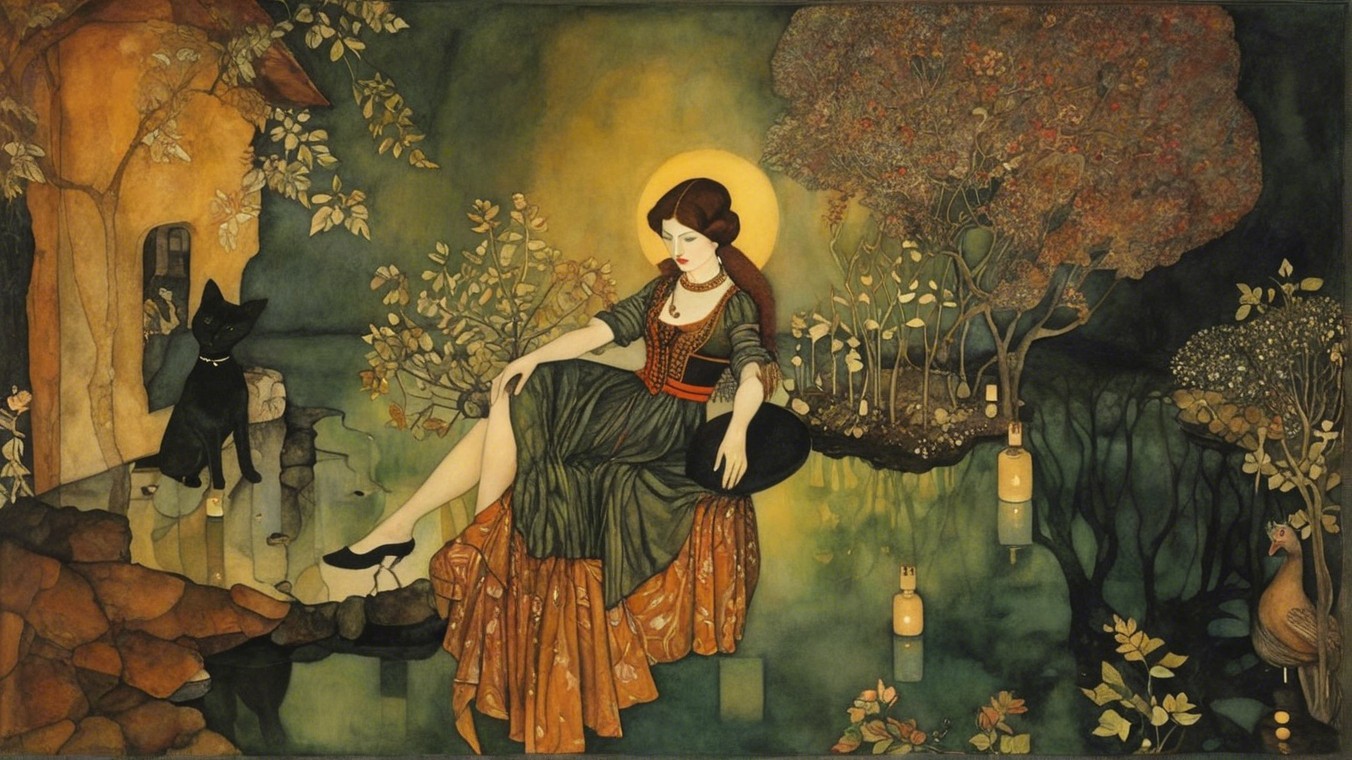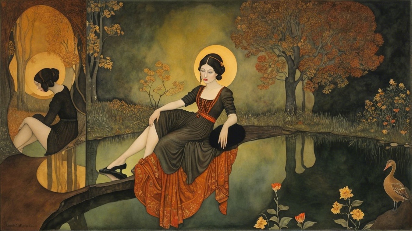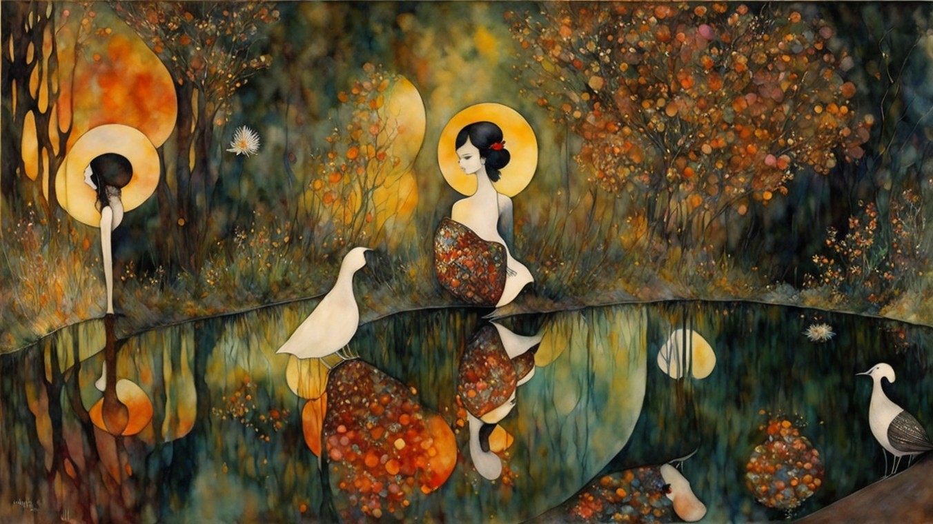 The artwork features three women in intricate headdresses, set against a serene landscape with a reflective water surface. Their expressions are contemplative, surrounded by muted, natural tones.