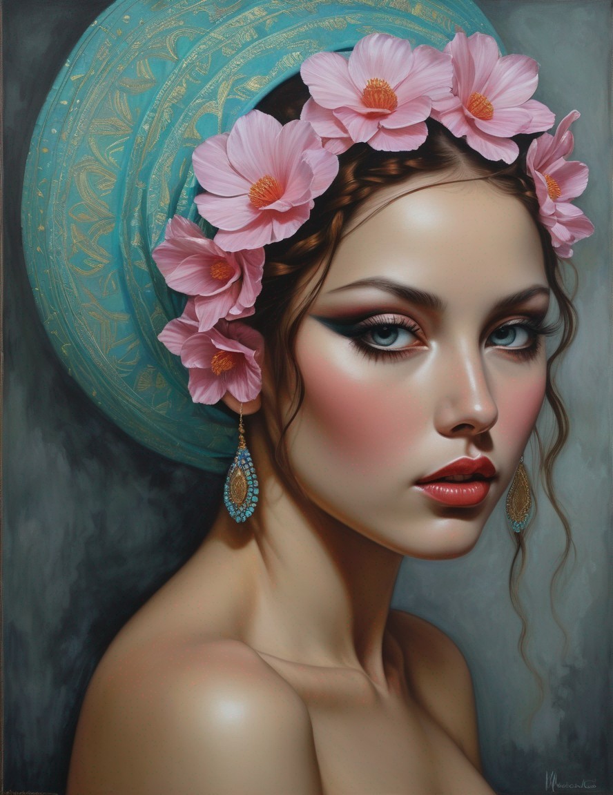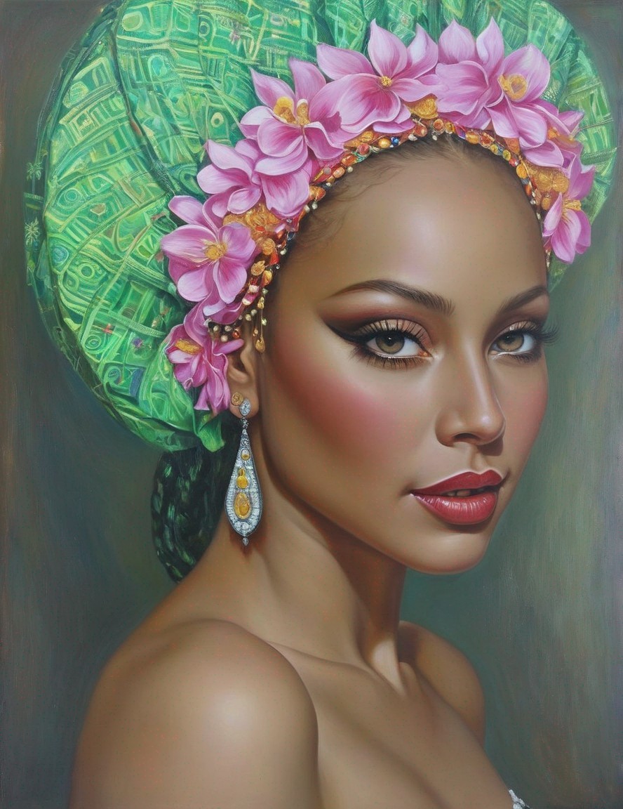 A portrait of a woman with large, expressive eyes, wearing a turban and gold earrings, evoking a classic, timeless beauty.