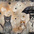 The image depicts two cloaked figures and a child, all wearing eerie masks with large eye sockets, standing beneath dark umbrellas. A stylized dog accompanies them against a misty, moody landscape.