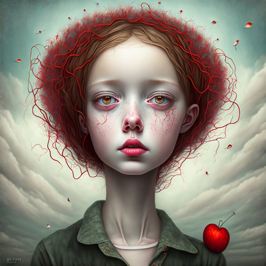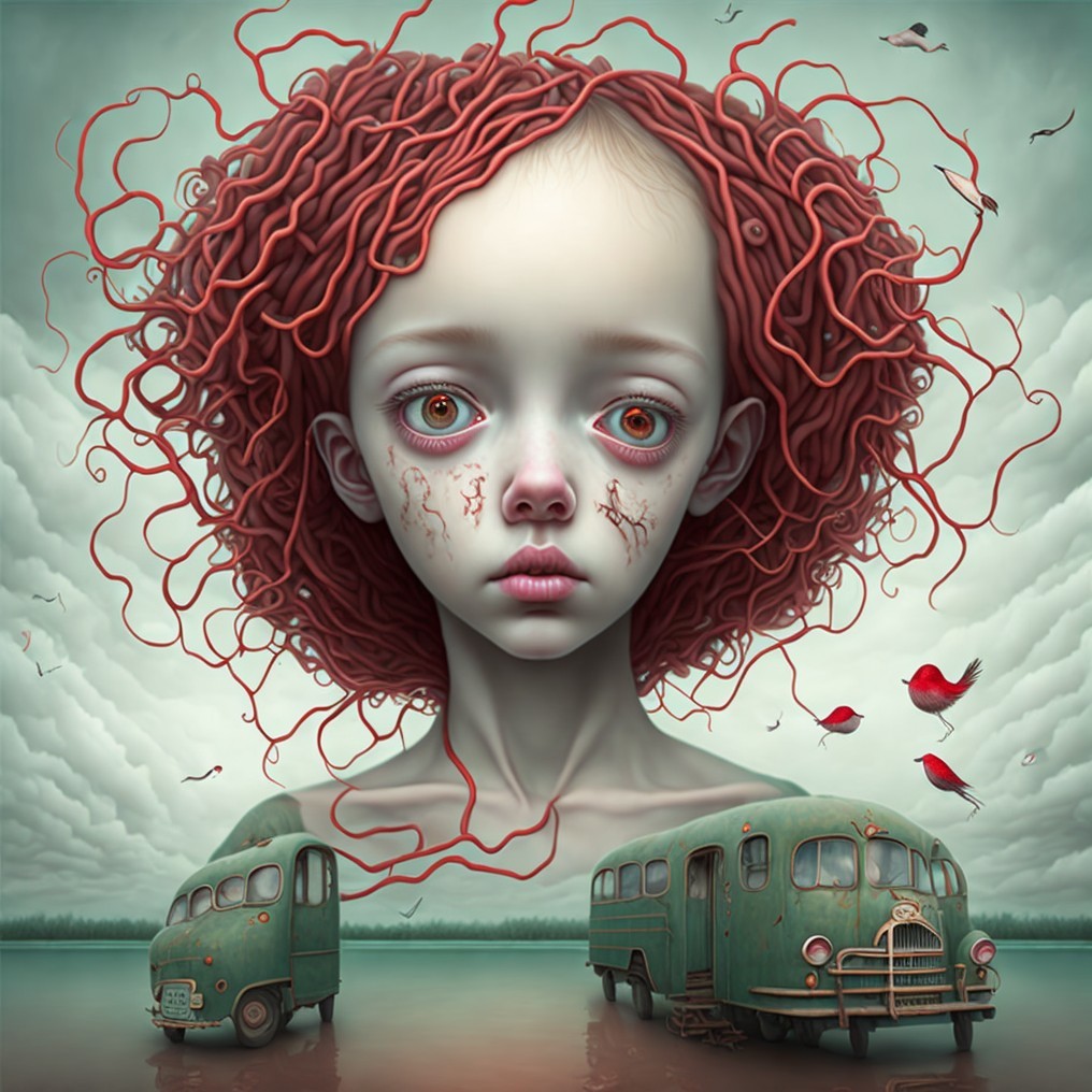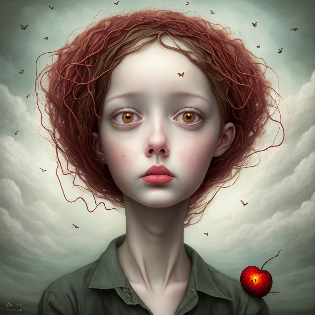 + Prompt:Art by Steve Cutts combine with Bio-Surrealism of Massurrealism in Peca Art style in art by Ulla Thynell in style of wonderful digital arty by Ed Binkley and graphite drawings that combine the subtle details of a Wyeth setting, line work reminiscent of Egon Shiele with beautiful textile patterns in a refreshing way of the Drowning Jeeper Creeper Red Spirit for a blue Monday in green swirly flames, as character from xeno machinarium in post apocalyptic environment, in a style of René Magritte modern and contemporary art, Fernando Botero Paintings, scattered dementia work with Twig Noir 2020 Matt Lombard