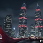 A futuristic urban landscape features a towering building design with lush greenery integrated into its structure, illuminated against a moody, twilight backdrop, creating a vibrant, eco-friendly atmosphere.