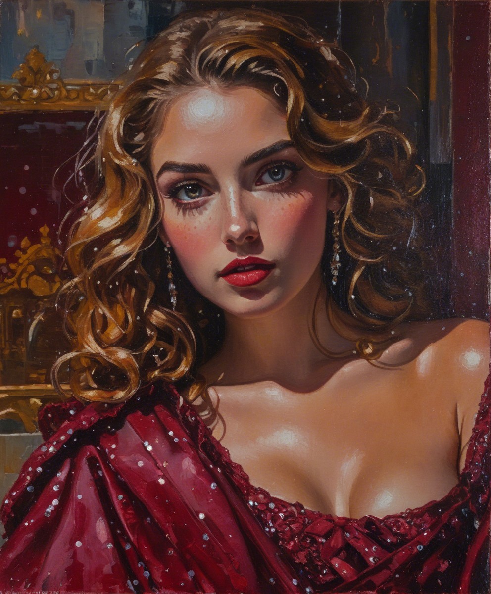 Captivating close-up oil painting of a beautiful young woman with light brown skin, with blue eyes and light hazel eyes, light brown wavy hair, wearing a sparkly red luxurious dress, with sparkling diamond earrings, with a red velvet background, with a gold ornament on the left, with small sparkles all