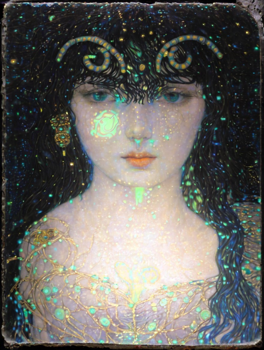 Portrait of Woman with Blue Eyes and Curly Hair in Glowing Lights