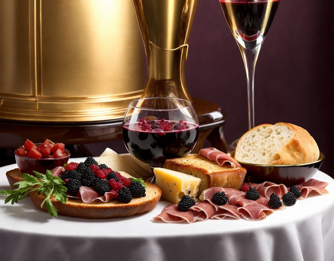 A luxurious spread with wine, fruits, cured meats, and bread against an elegant backdrop.