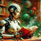 A sleek robotic figure with a reflective surface is engrossed in reading a book, surrounded by swirling, luminescent energy. Shelves of books fill the background, creating a cozy atmosphere.
