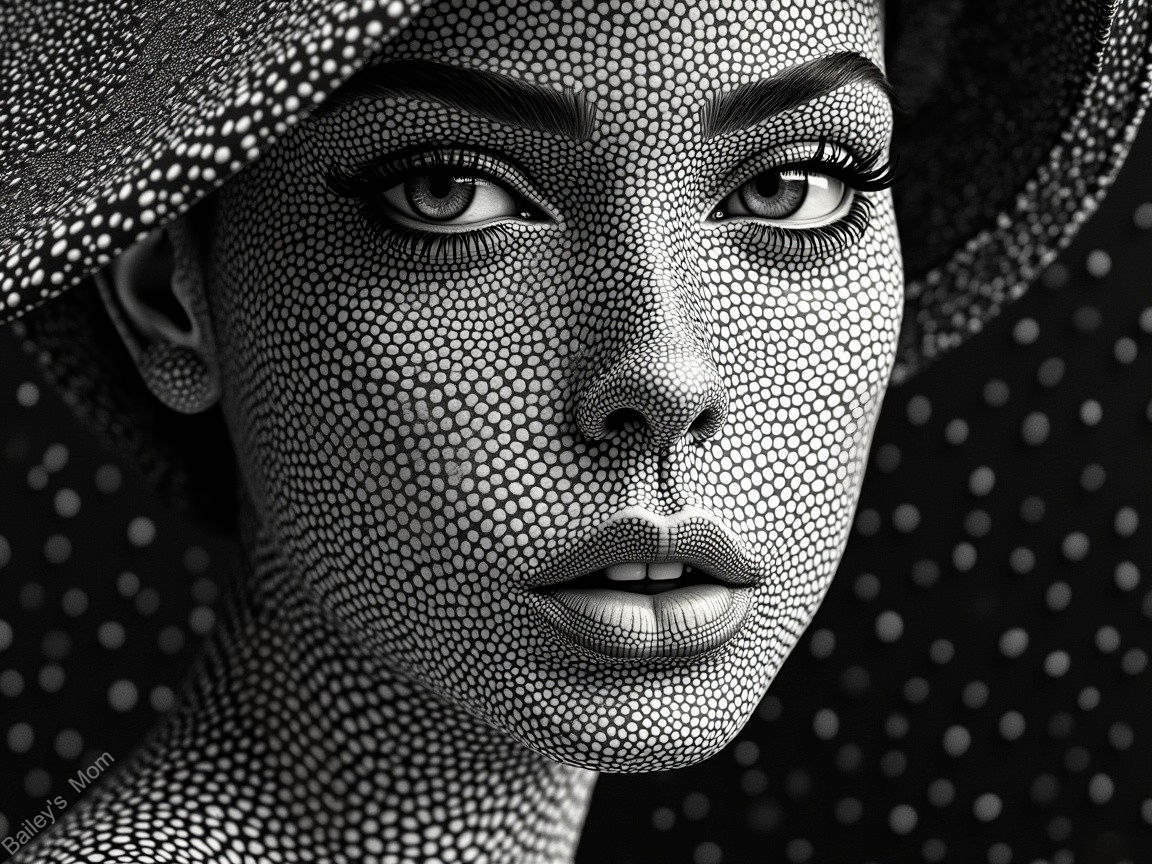 A striking portrait in black and white, featuring a woman with intricate dot patterns covering her face and body. She wears a wide-brimmed hat, enhancing the artistic, stylized appearance.