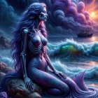 A skeletal mermaid with vibrant, flowing hair sits on a rocky beach at sunset. An old ship sails in the background as waves crash gently, creating a hauntingly beautiful scene.