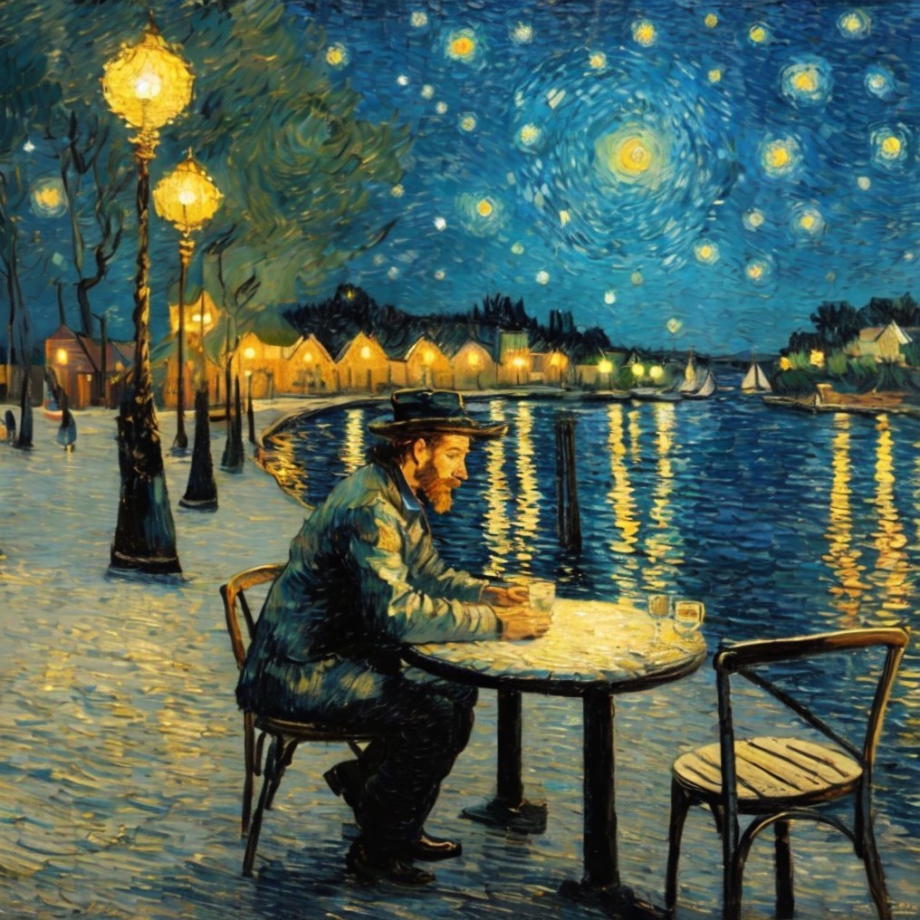 Prompt: Brilliant starry night, sea, sailboats, gold moonlight on the water, gold water ruffles, coastal rocks, small houses, Van Gogh style, soft colors.