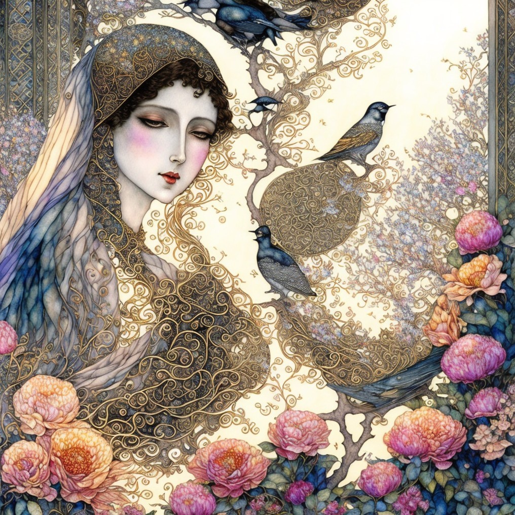 An illustration depicting an ethereal woman in ornate attire with a bird on her hand, against a backdrop of a serene landscape and castle.