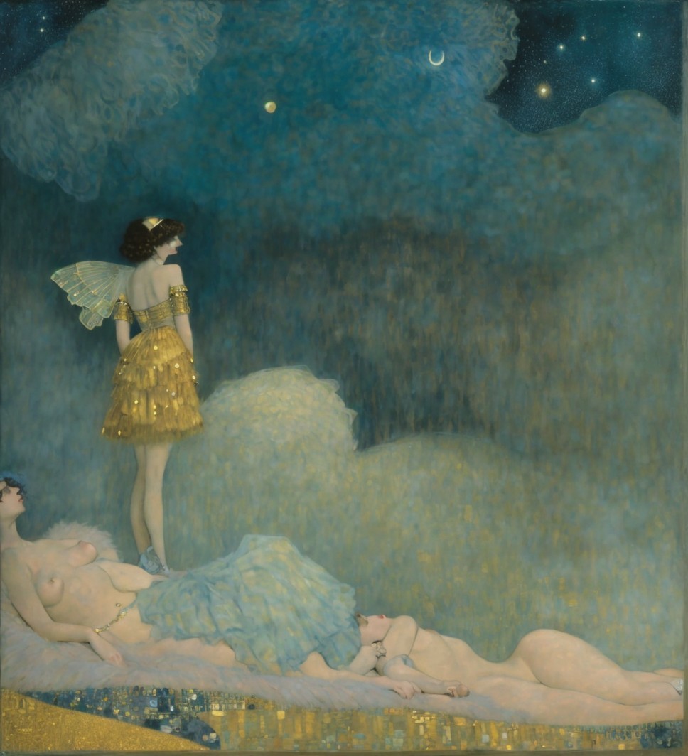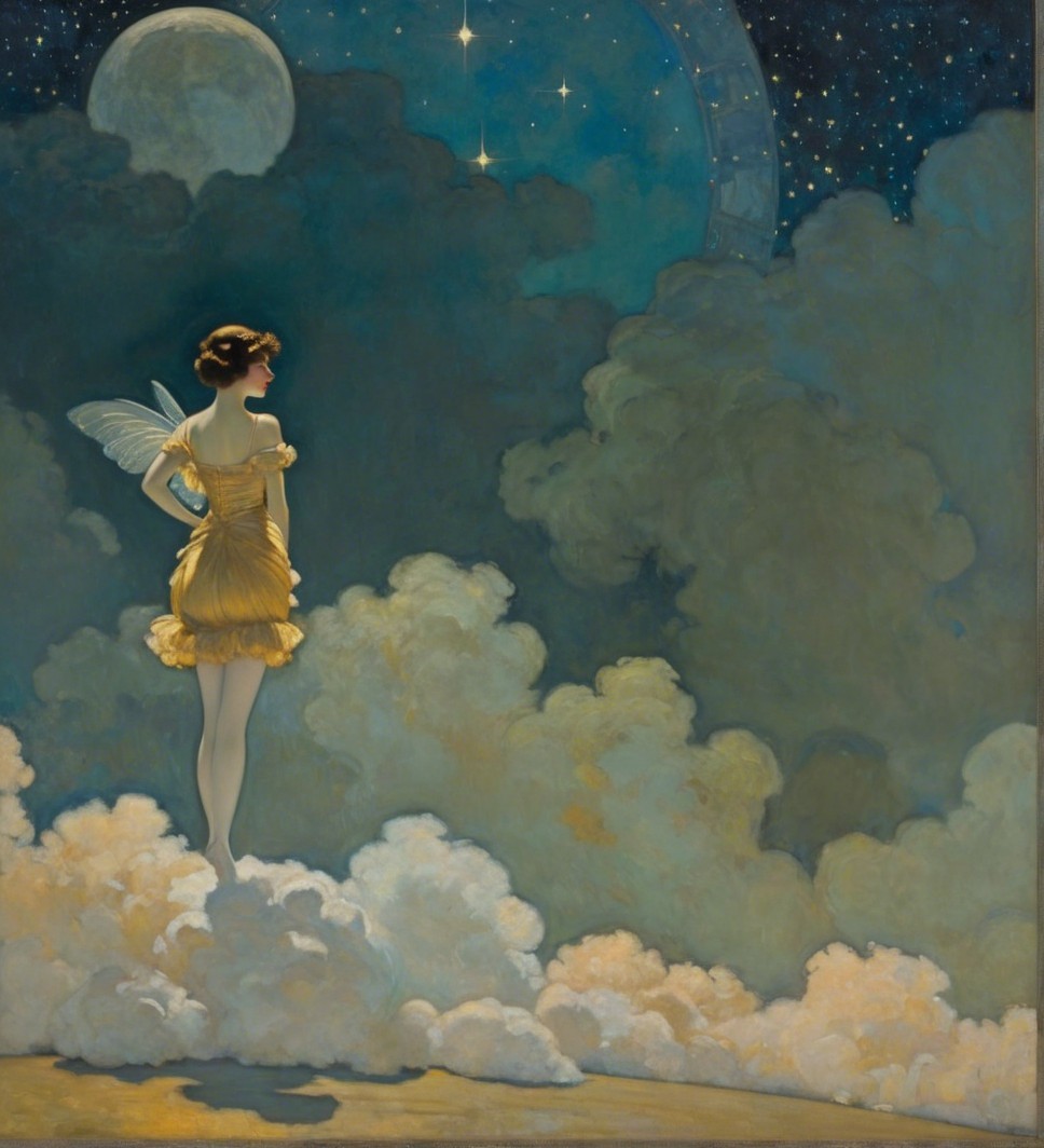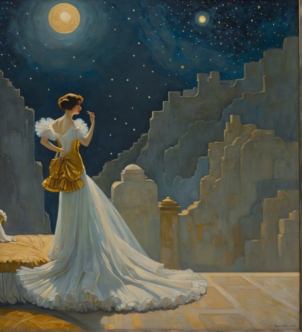 A woman in a flowing, elegant gown stands on a balcony under a starry night sky, gazing at the moonlit landscape. A figure in formal attire watches her, creating a sense of enchantment and mystery.