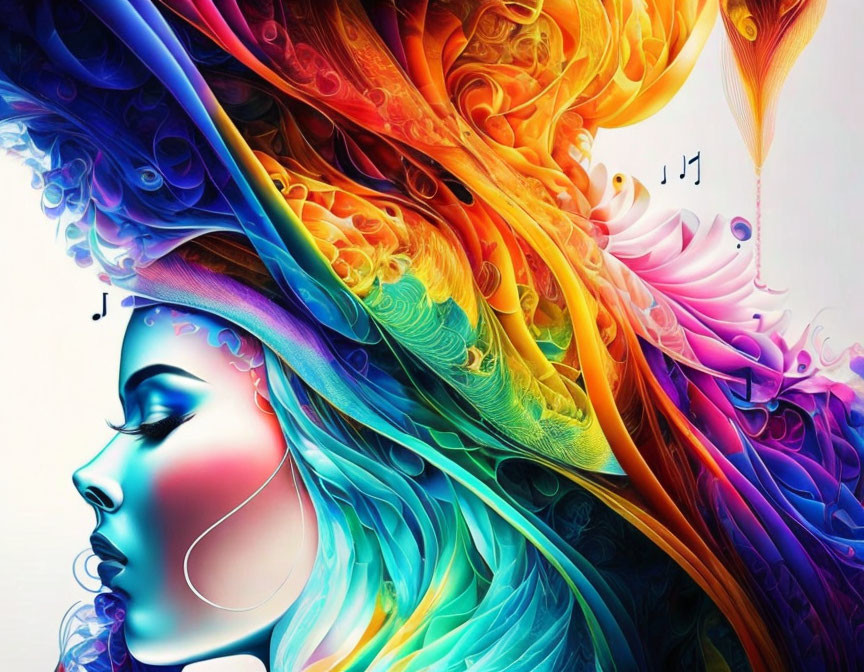 Colorful digital artwork: Woman's profile with flowing hair and musical notes