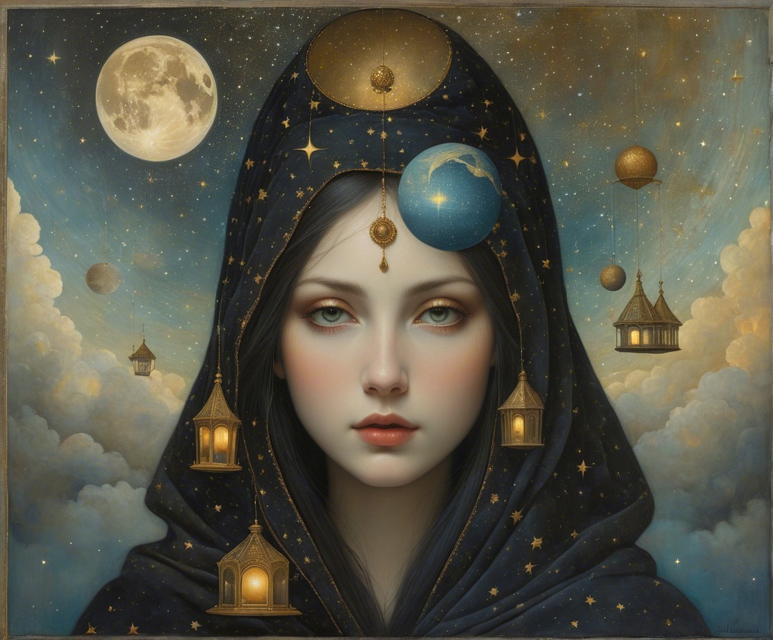 The image features a luminous, ethereal woman with striking blue goggles and intricate jewelry. Her long hair cascades elegantly, framed by a halo of soft, swirling colors and delicate feathers.