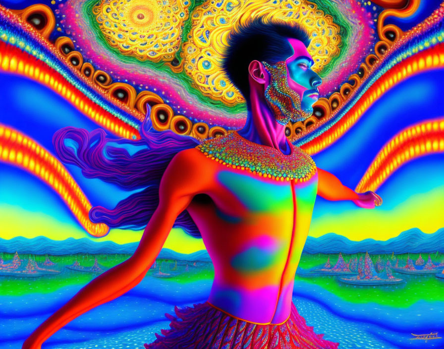 Stylized figures with intricate body patterns on vibrant psychedelic background