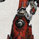 The image features a detailed and intricate statue of a mechanical figure with a menacing design, adorned with skull motifs and a dark red color scheme, showcasing a blend of science fiction and gothic elements.