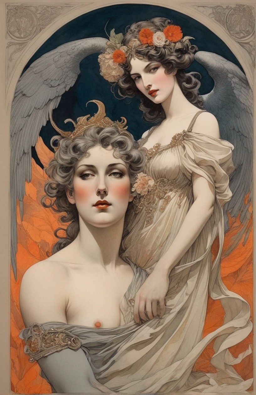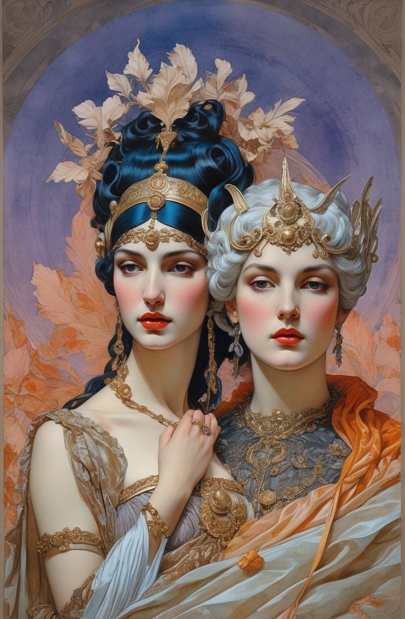 Art Nouveau inspired illustration of two elegant women with ornate hair and headdresses in warm and cool