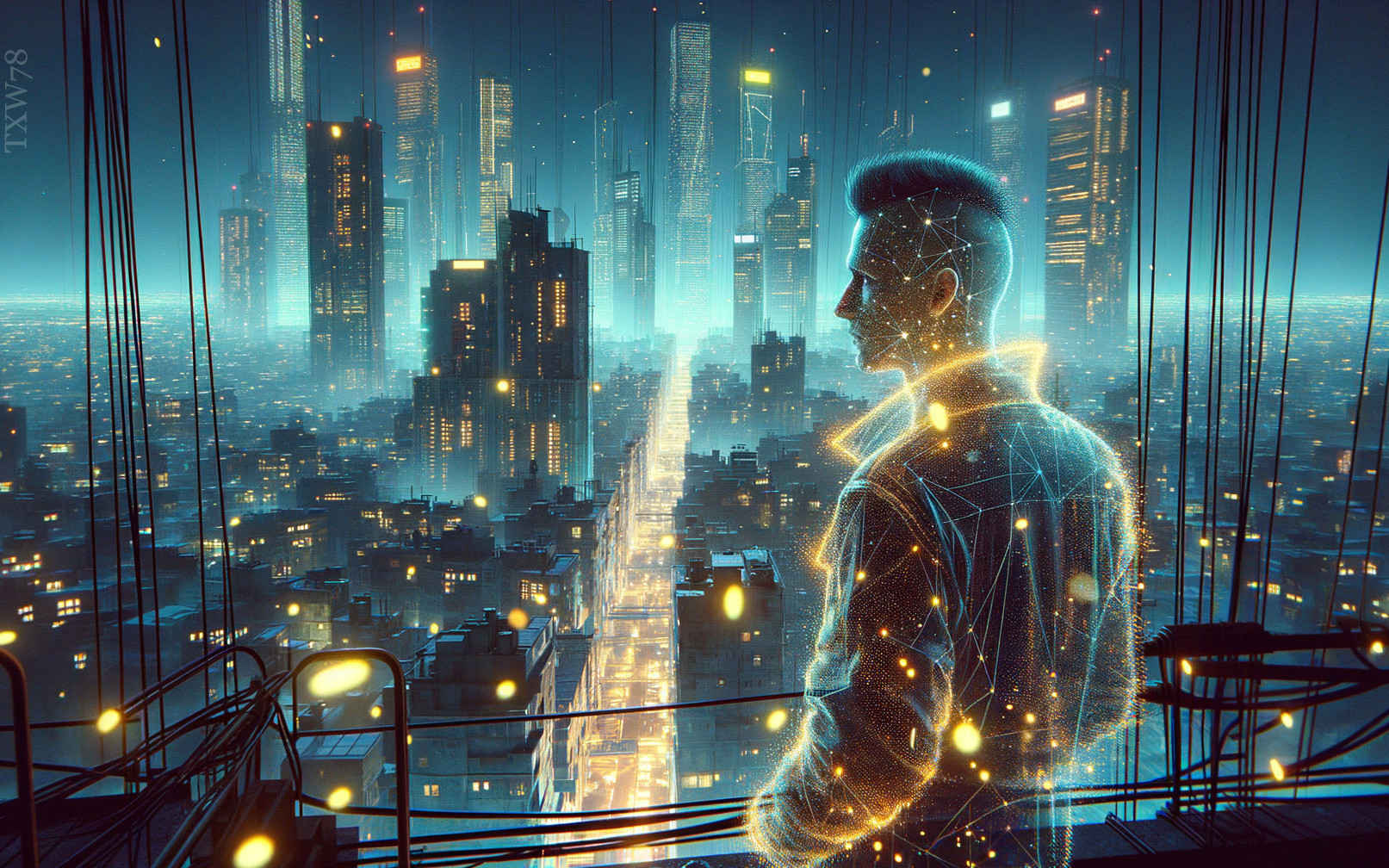 A vibrant night cityscape showcases neon lights and towering skyscrapers. A translucent figure stands on an abandoned building's edge, surrounded by glowing ashes and crisscrossing wires, evoking introspection.