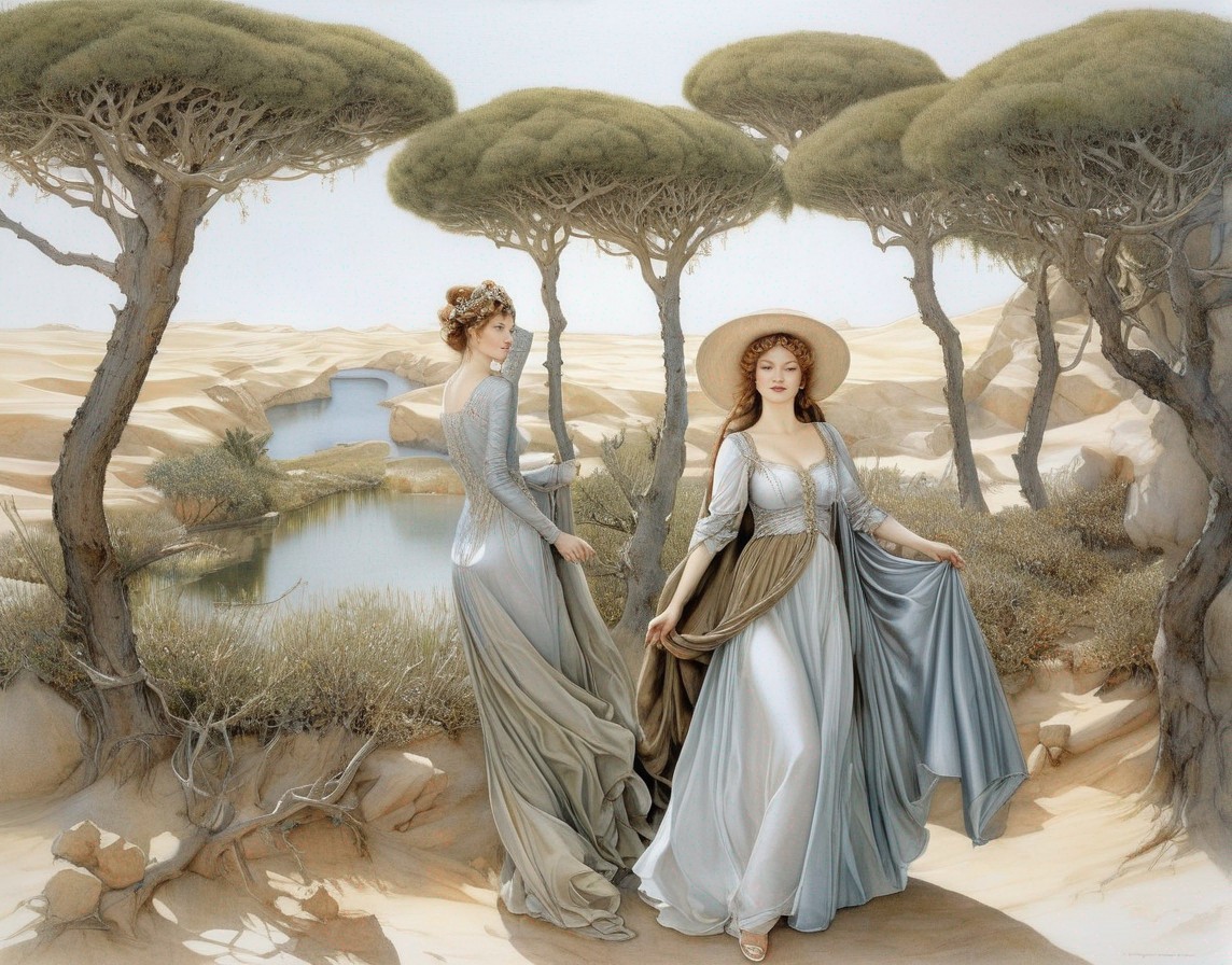 A woman in a flowing blue gown stands before a fantasy landscape with mushroom-shaped structures and an elegant city by a tranquil lake.