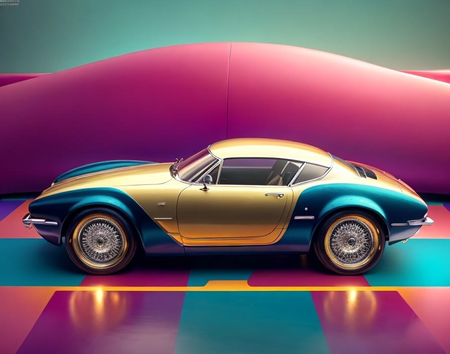 ("Try it" from Norman Dick) - A classic car with a colorful gradient paint job against a vibrant background with a purple-to-pink gradient and a multicolored floor.