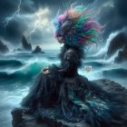 Mermaid with Vibrant Hair in Dramatic Seascape