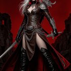 A fierce warrior stands confidently, dressed in a dark, stylish ensemble with a long coat, thigh-high boots, and a sword. The dramatic red backdrop enhances the powerful presence. (The base image was created with Raphael app)