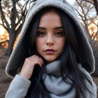 A young woman with long, dark hair wears a cozy gray hooded sweater. She gazes thoughtfully at the viewer, set against a backdrop of vibrant, stylized trees and a colorful, dreamy sky.
