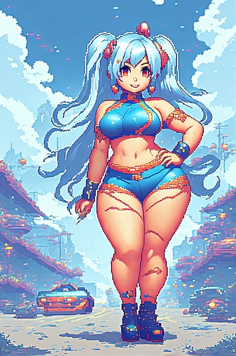 pixelated, video game esthetics, retro game graphics, retro game character, sexy video game mascot, curvy thick attractive cute petite Filipina girl confidently posing with a playful smile, retro gaming 90's 16-bit 2D video game sprites esthetic, in sensually tight traditional attire, big thick legs, thick thighs, vibrant pig tails silver blue hair cascading in soft waves down to her broad shoulders. very big chest, dressed in a form-fitting ensemble that accentuates her curvy figure, stylish crop top that reveals her midriff adorned with a delicate navel piercing. fishnet stockings, tattoos, video game victory pose, fighting game, main elegant fighting warrior, high-waisted ripped shorts, foreign slums, dirty trash filled streets, defeated warrior male opponent on the ground. rosy cheeks, winks at subject, hazel eyes, drawing the viewer's gaze to her striking facial features. stands with one hand on hip, city streets evoking a sense of epic fantasy, dramatic atmosphere, highlighting the game graphics textures