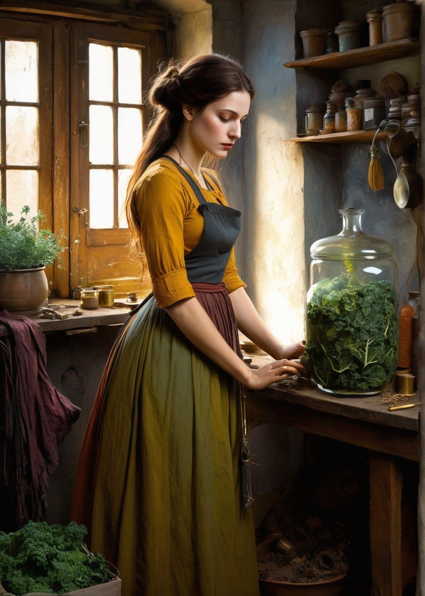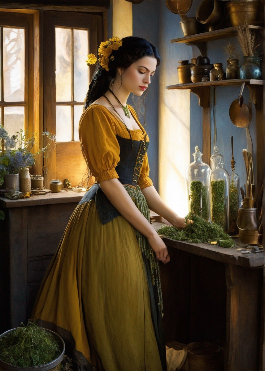 + Prompt:In her workshop stands a beautiful woman who is an herbalist and voodoo practitioner. she is depicted in a style reminiscent of the works of Johannes Vermeer and Arthur Rackham. The scene is reminiscent of the watercolor paintings of Kandinsky and the art nouveau style of Gustav Klimt. it is a testament to the skill of the artist, Rebecca Guay.
