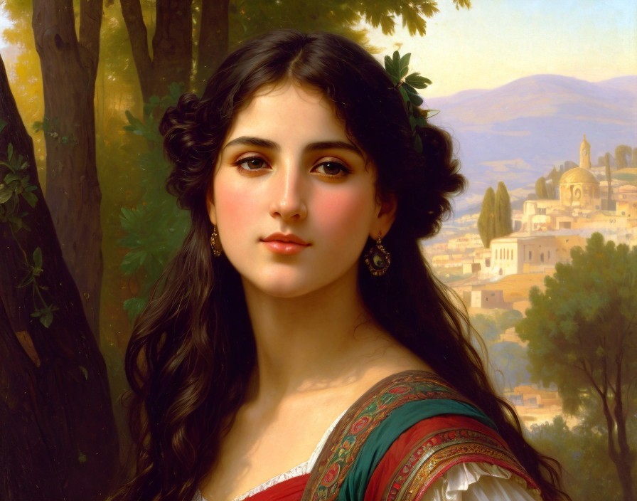 A portrait of a young woman with dark hair and jewelry, gazing forward against a backdrop of trees and flowers.