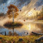 A serene autumn landscape features a lone tree on a small island surrounded by a calm lake. Vibrant orange leaves swirl in the air, reflecting on the water under a colorful sky.