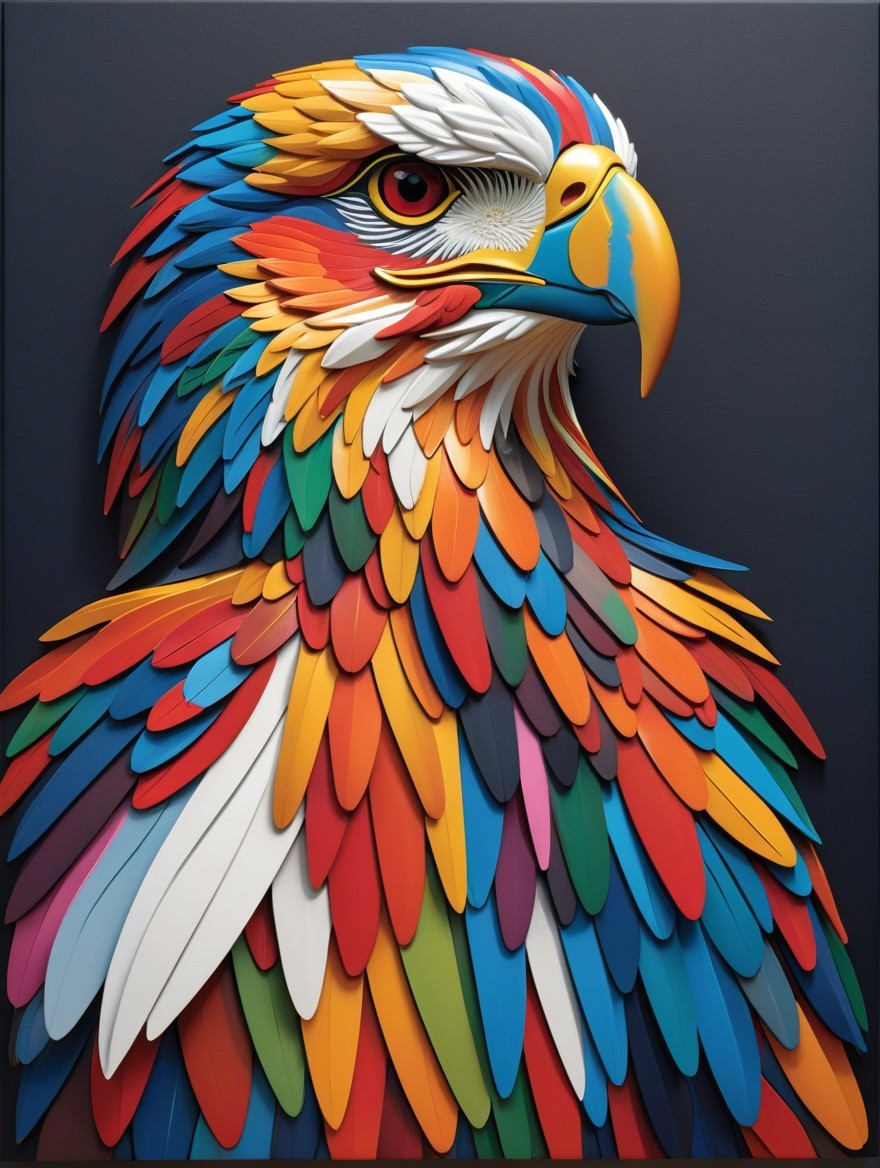 This vibrant artwork features a stylized eagle head, adorned with a mosaic of colorful feathers. The intricate design showcases a blend of bold colors and detailed textures, creating a striking visual effect.