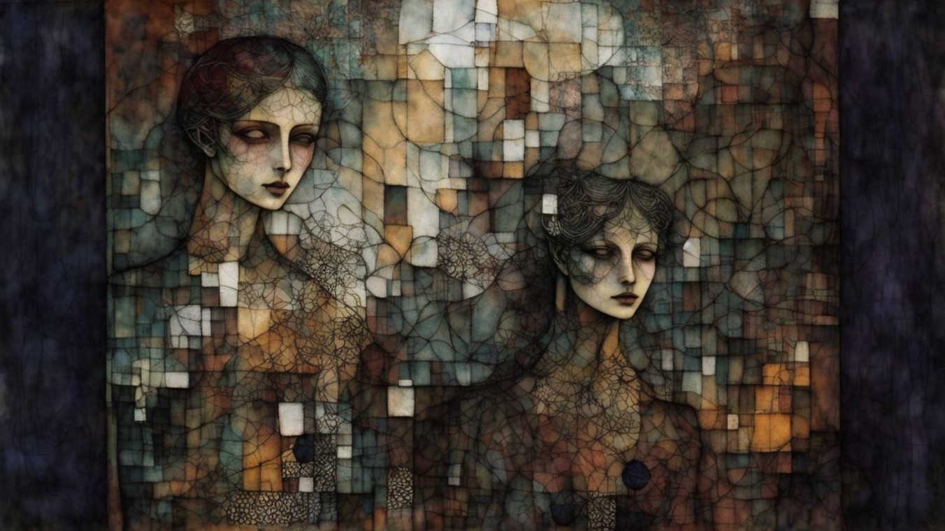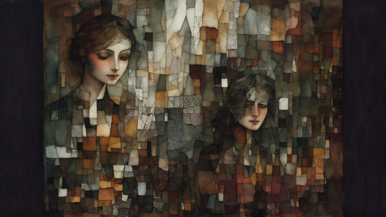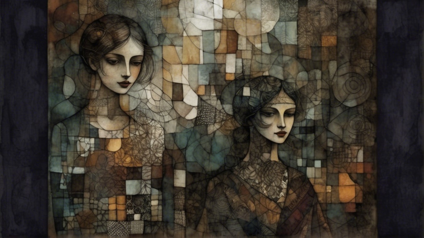The image features two abstract, female figures with expressive faces, surrounded by a mosaic of geometric shapes. Warm earthy tones blend harmoniously, creating a serene, artistic atmosphere.