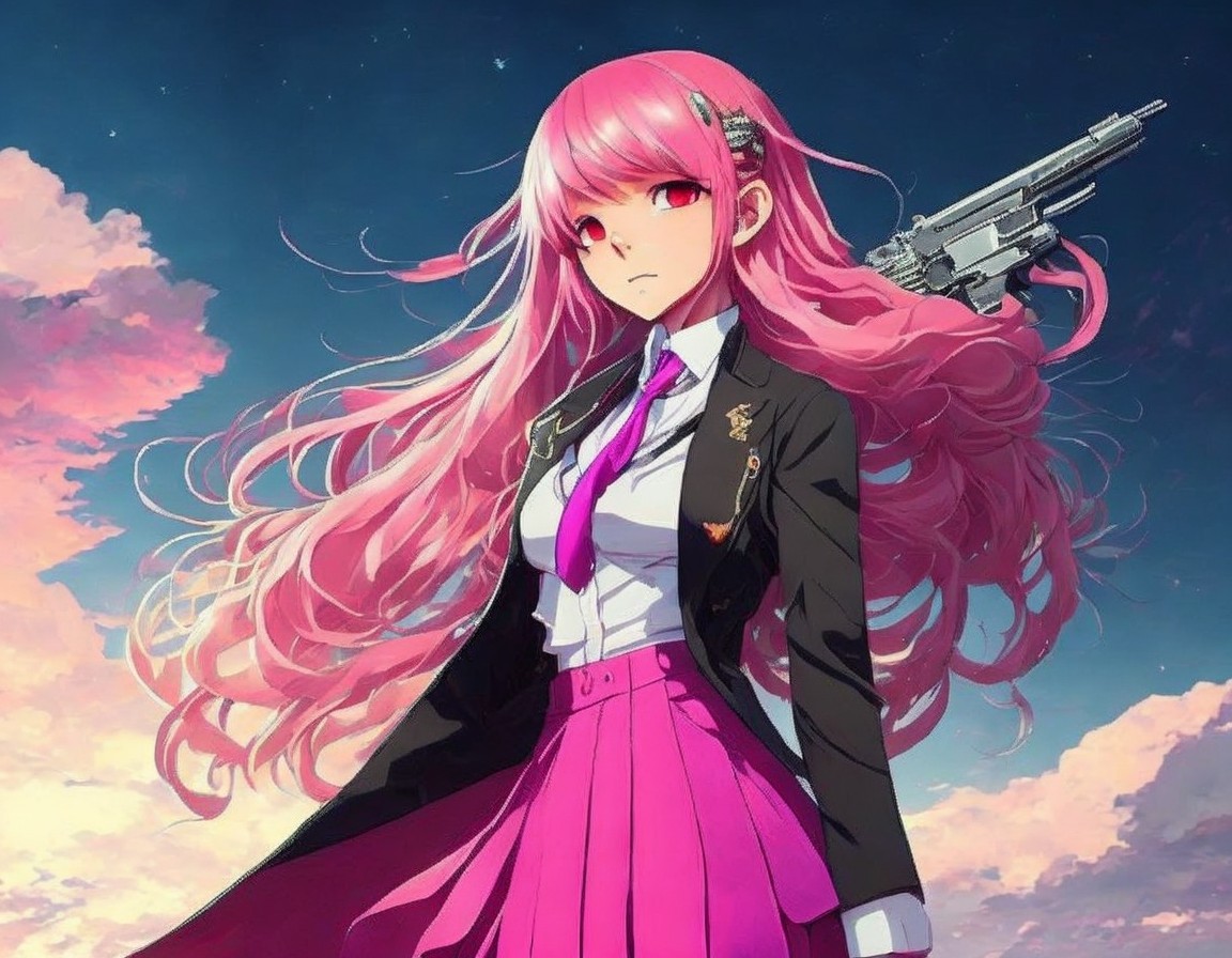 A girl with long, pink hair wearing a school uniform stands confidently against a bright sky with fluffy clouds and a rainbow, exuding a sense of youth and optimism.