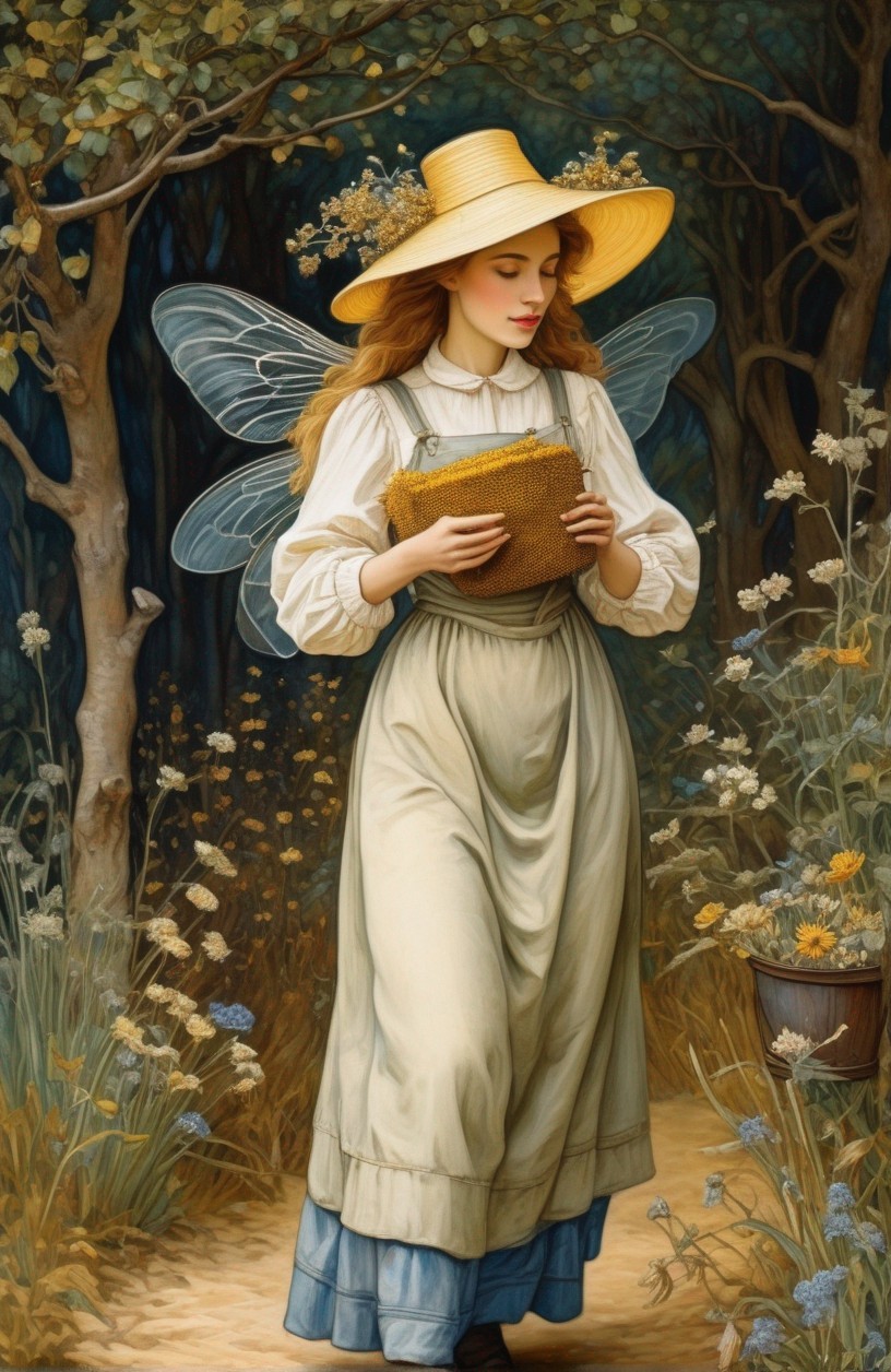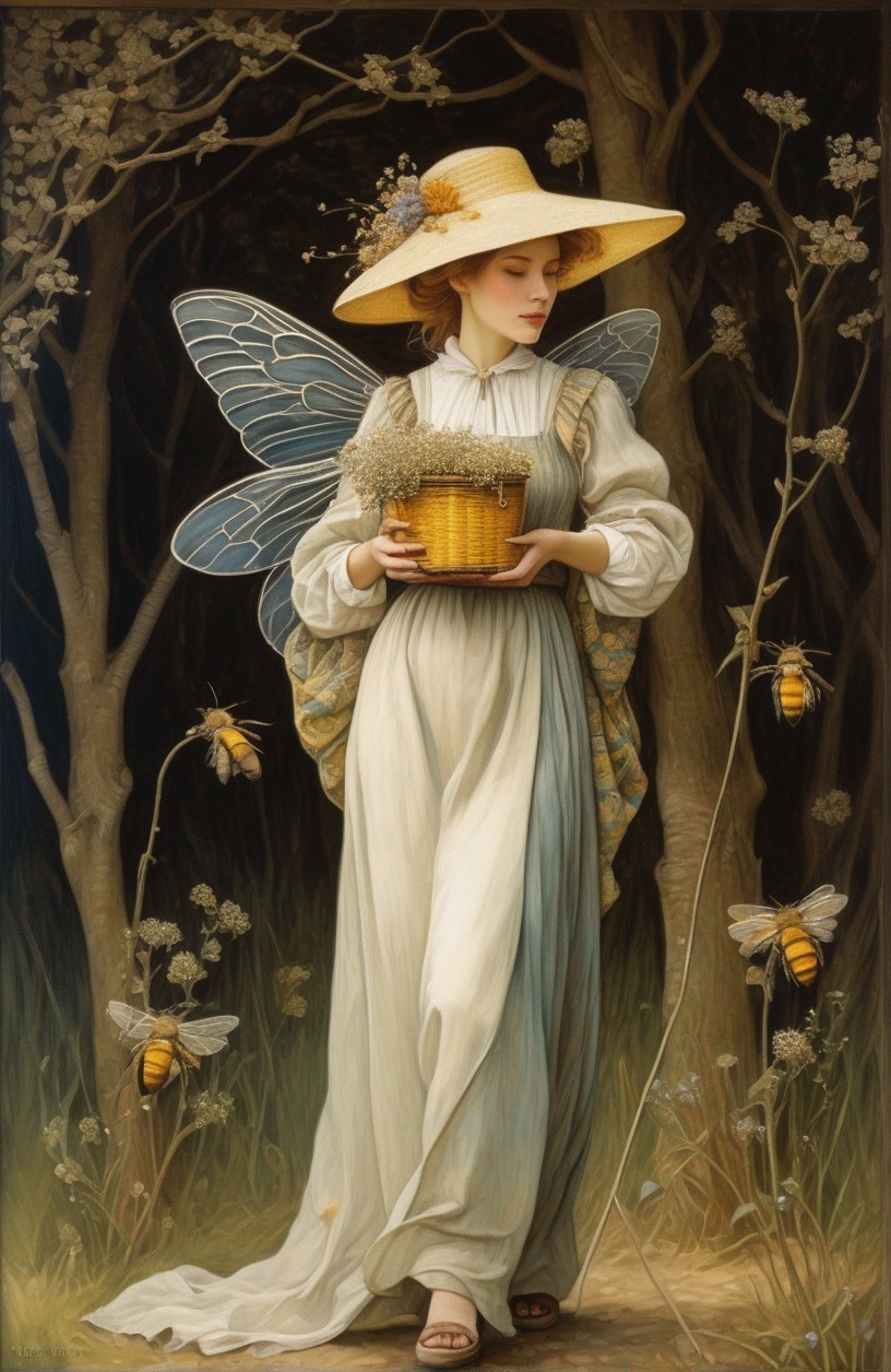 A woman in a vintage dress and hat with a basket walks in a flower-laden forest.