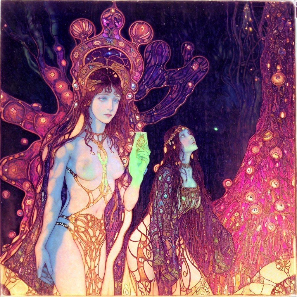 Two ethereal women with ornate headdresses in a vivid, fantastical setting, exuding a mystical atmosphere with glowing elements and starry backdrop.