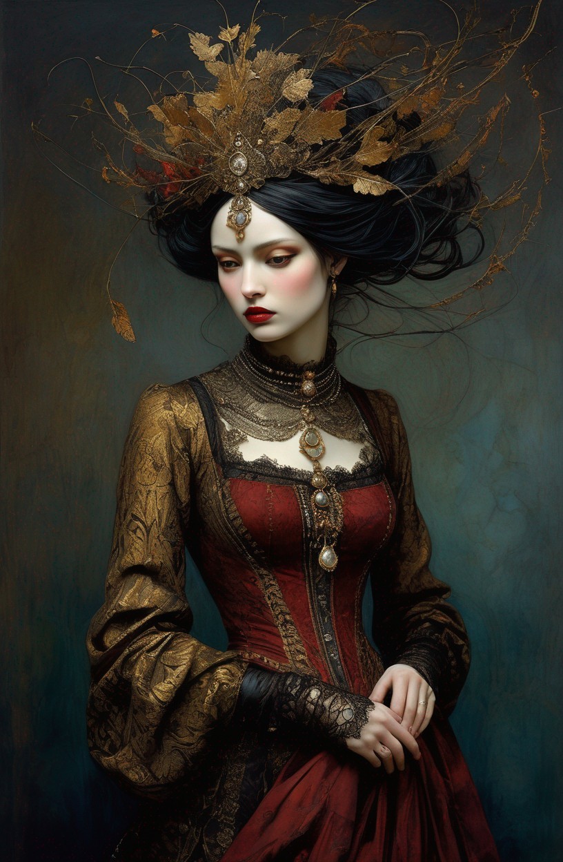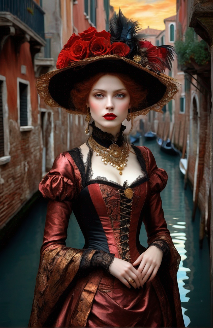 Prompt: She's as beautiful as death, as seductive as sin, and as cold as virtue. Magical enchantress of Venice. colors rose, gold, rust, burgundy, black.