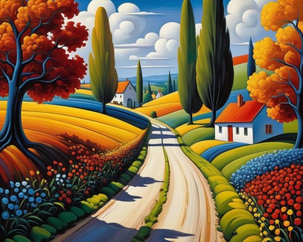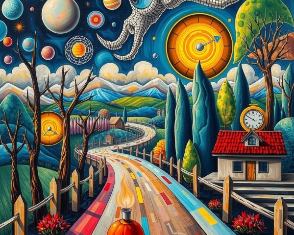 A vibrant, surreal rural road scene unfolds with intricate details and vivid colors, blending dreamlike elements and abstract forms, evoking a hallucinogenic, otherworldly experience.