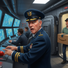 In a high-tech control room, a shocked military officer frantically points at computer screens. An Amazon delivery person stands at the door, holding a package, creating a humorous contrast.