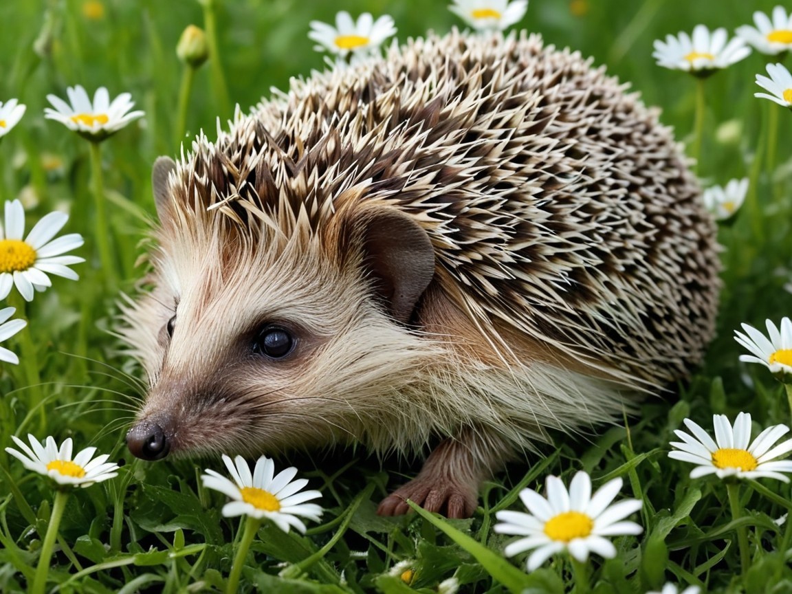 A close-up photograph of a small brown hedgehog with a spiky back and soft belly, with its head turned to the left, standing in a lush green field of green grass with many white daisies and yellow centers blooming all around it.