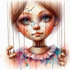 A stylized portrait of a young girl with vibrant blue eyes and colorful paint drips on her face. Her pigtails frame a delicate expression, blending whimsical and dramatic elements.