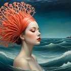 A stunning female figure with flowing blue hair adorned with vibrant coral accents, set against a dramatic sunset and ocean backdrop, exuding a blend of natural beauty and artistic flair.