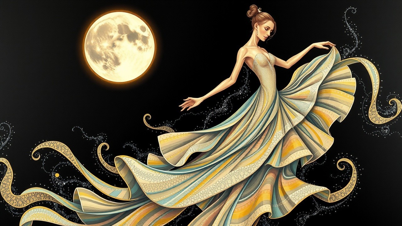 Radiant porcelain , graceful dancer under super moon, slender figure, intricate details, flowing textures, suspended world, fluid couture textiles, hyper-detailed graphic line art, painting techniques, impasto brush strokes, Van Gogh nicoletta ceccoli