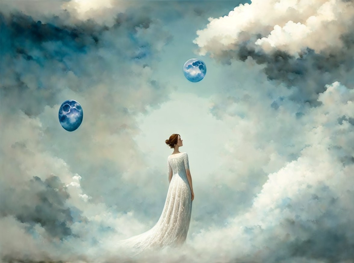 + Prompt:Landscape with woman and white clouds dream, blue and white dream, moonlight, cinematic light. volumetric light, soft colors, surreal, Endre Penovac and Catrin Welz Stein,