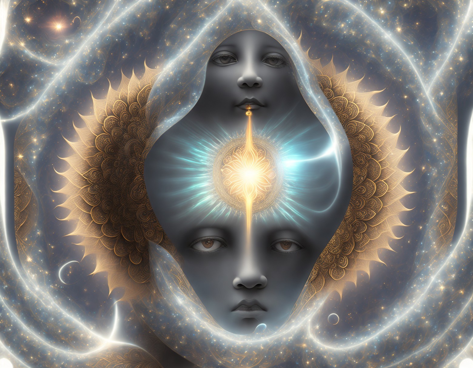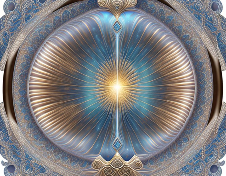 A stunning cosmic scene showcasing a radiant central star surrounded by concentric rings and vibrant celestial bodies, set against a backdrop of deep space with distant galaxies and shimmering stars.